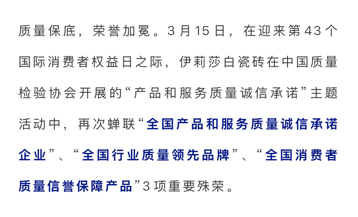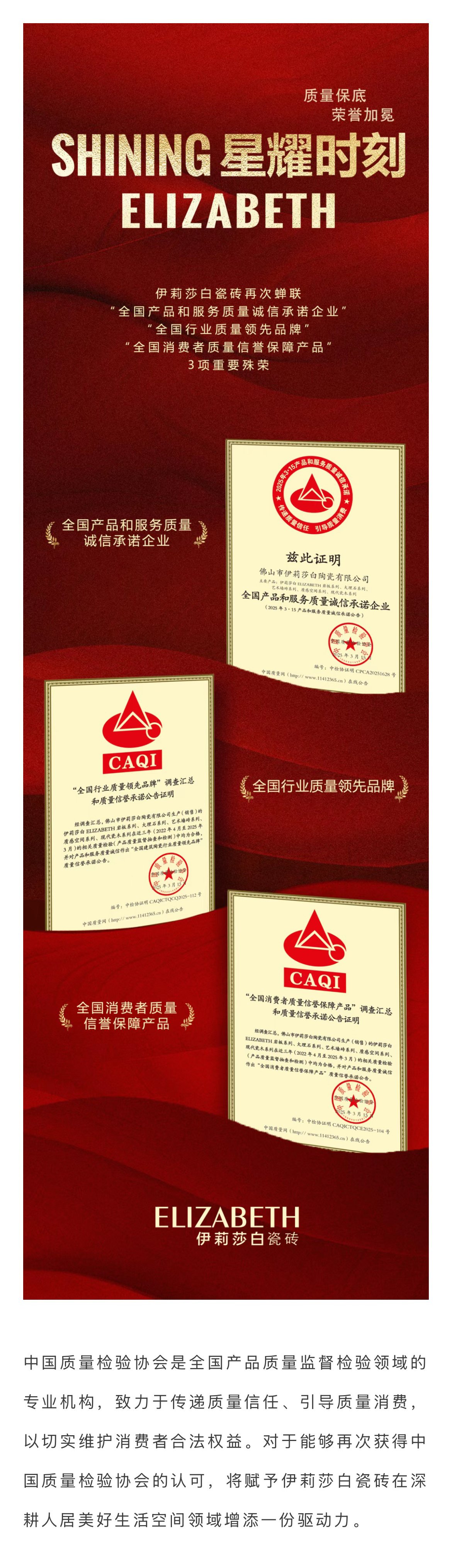 Shining星耀時刻 | 伊莉莎白瓷磚蟬聯中國質量檢驗協會3項重要殊榮